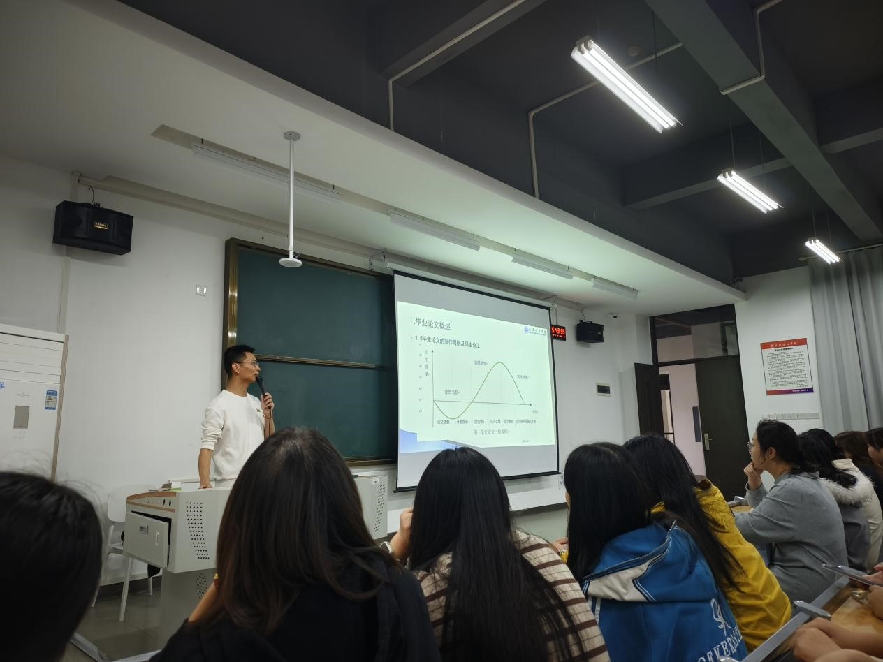 余教授围绕毕业论文的五大核心环节展开讲解:毕业论文概述、选题策略、材料搜集与整理、撰写过程及答辩准备。他系统阐述了毕业论文作为高校人才培养重要环节的意义,指出论文不仅是学术能力的体现,更是解决实际问题能力的综合锻炼。