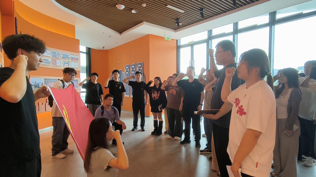 在重温入党誓词环节,全体党员齐举右手、紧握成拳面向党旗,在于海川同志的领誓下,重温入党誓词。铿锵有力的誓言响彻校史馆,彰显着同志们对党的忠诚与为共产主义事业奋斗终身的坚定信念。