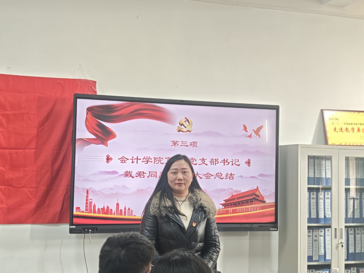 会议最后,会计学院学生第二党支部戴君书记作总结发言。她指出,全体同志要深刻领会会议精神实质,将个人发展与国家战略紧密结合。她希望同志们以此次学习为契机,把规划目标转化为实际行动:在专业学习中践行创新精神,在社会实践中服务国家需求,以青春力量助力“十五五”规划落地见效;加强理论学习与实践锻炼,端正入党动机,严守预备期要求,锤炼过硬作风,早日成长为合格乃至优秀的共产党员;凝聚支部合力,互学互促,共同提升,立足岗位履职尽责,充分发挥先锋模范作用,推动支部各项工作提质增效。