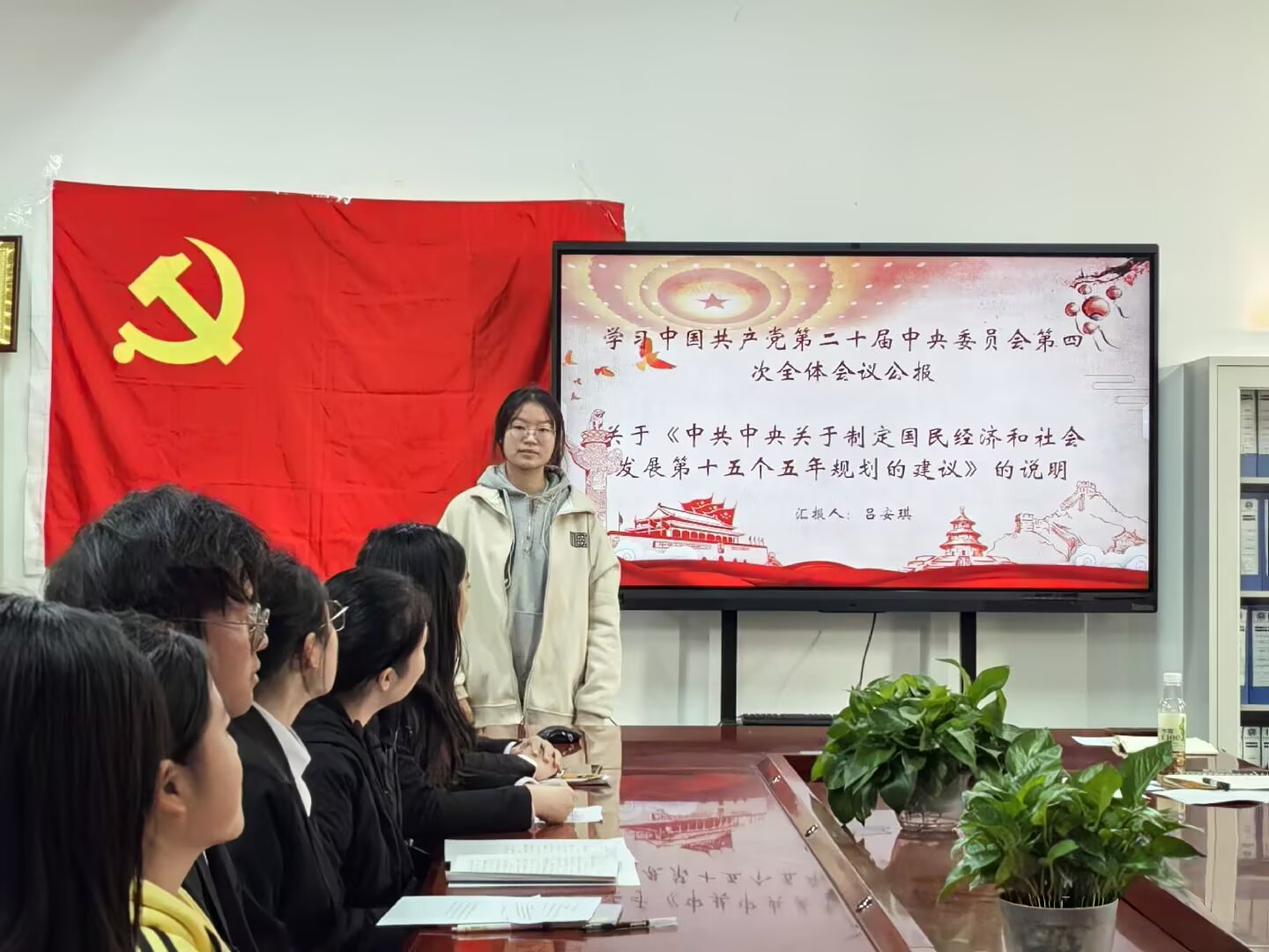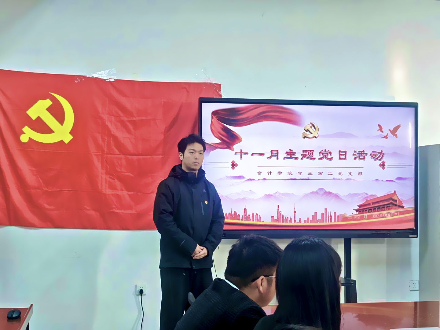 为深入学习贯彻党的二十届四中全会精神,引导支部党员准确把握“十五五”时期经济社会发展的目标任务与战略部署,2025年11月21日,会计学院学生第二党支部在综二310开展了十一月主题党日活动。本次活动由郝家俊同志主持,支部全体党员及发展对象准时参加。