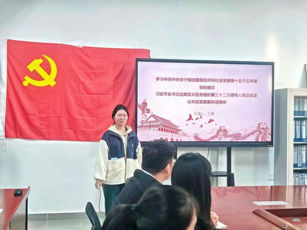 随后,王雨同志带领大家系统学习了两大核心内容:一是中共中央关于制定国民经济和社会发展第十五个五年规划的建议,二是习近平总书记出席亚太经合组织第三十二次领导人非正式会议的重要讲话精神。她进一步强调,要将“铸牢中华民族共同体意识”贯穿国家发展全局,把‘两路’精神有机结合,同步推进政策制定与国际合作,这是实现“基本现代化”与“共建普惠包容亚太经济”双重目标的关键路径,为后续实践提供了明确的行动指引。