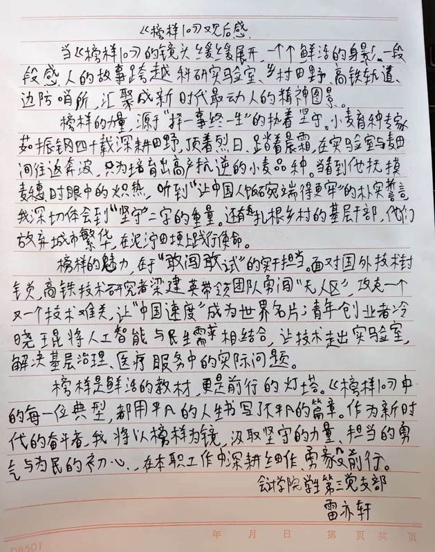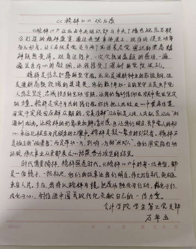 会计学院学生第三党支部石华玉同志分享:《榜样10》里的先进人物用坚守和奉献诠释了信仰的力量,他们在平凡岗位上做出不平凡的成绩,让人深受感动,也激励着我们在自己的生活中努力向上、勇担责任。