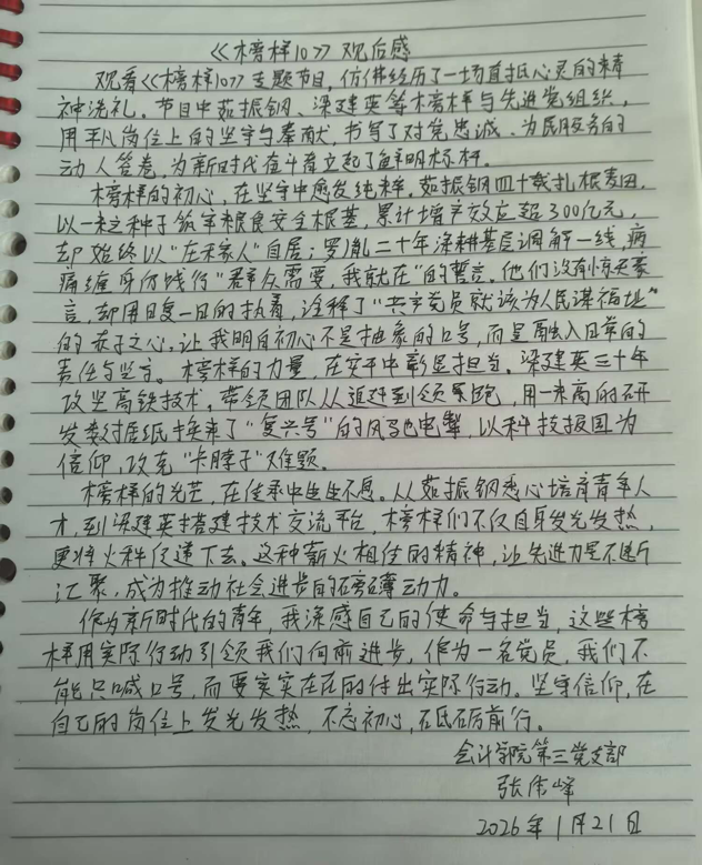 节目播出后,会计学院学生第三支部的学生党员们深受触动,被榜样们的先进事迹与崇高精神深深打动。大家纷纷表示,将以这些榜样为引领,不断锤炼自身思想政治素养,扎实钻研专业知识技能,为实现中华民族伟大复兴的中国梦添砖加瓦。