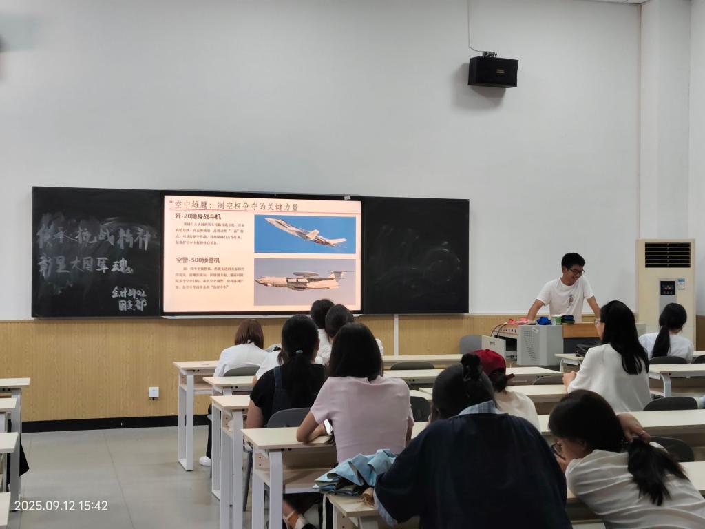 第三部分,同学们聚精会神,跟随罗致远同学的讲解,深入了解99A主战坦克、歼-20隐身战斗机等先进装备。这些“钢铁洪流”与“空中雄鹰”,是国防力量的硬核支撑,也让大家更深刻体会到,正是强大的国防,守护着和平,让抗战精神在新时代有了更坚实的底气传承。
