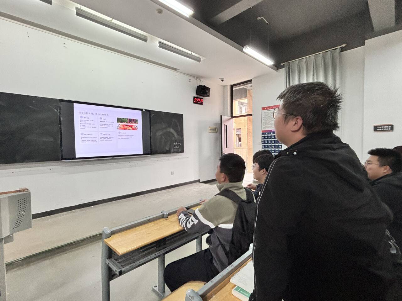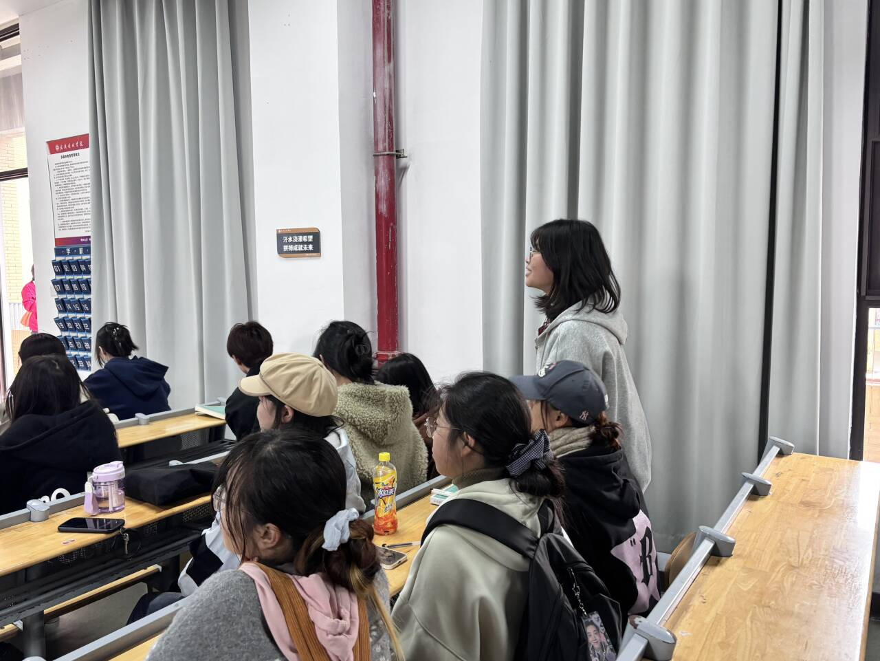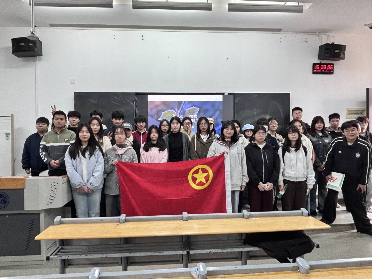 活动伊始,团支书朱滨彬走上讲台开启 “识・霜降” 环节。她通过 PPT 展示,介绍霜降是秋季最后一个节气,时间为公历 10 月 23 日或 24 日,太阳达黄经 210°,天气转冷露结为霜,南北气候呈现深秋与 “秋燥” 差异。