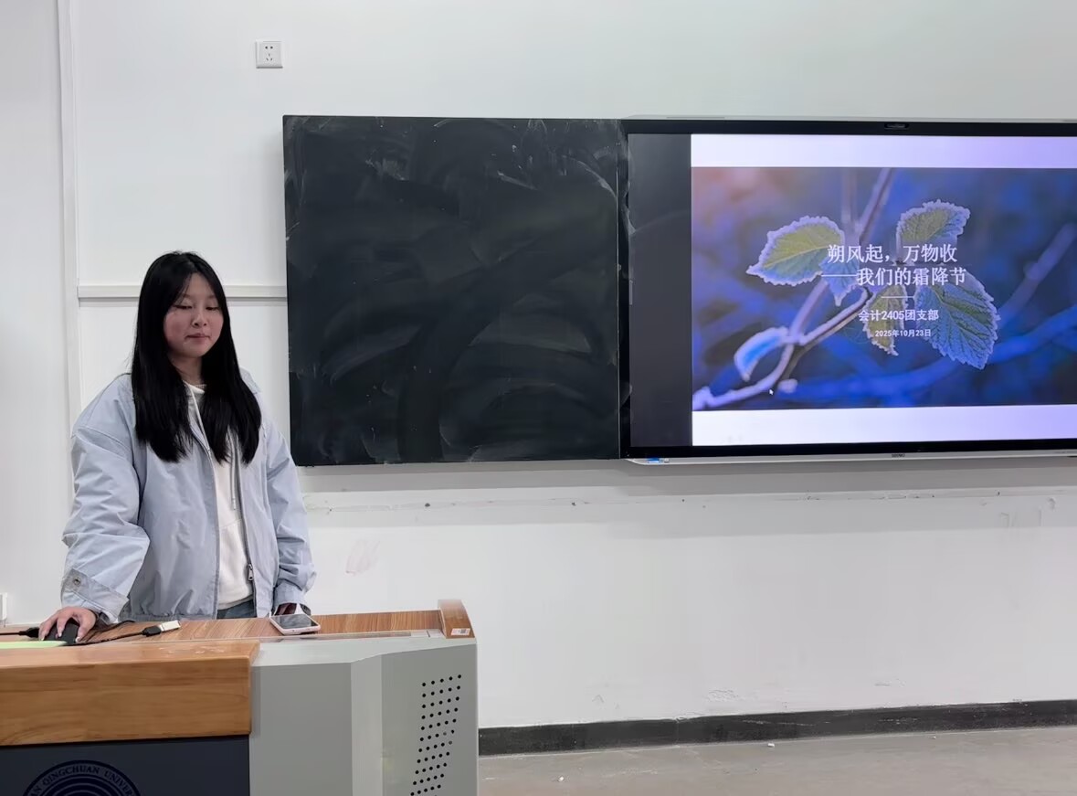 (通讯员:邓谢薇 辅导员:高梦瑶)为传承中华优秀传统文化,加深同学们对霜降节气的认知,2025年10 月 23 日在教1-313,会计 2405 团支部以 “朔风起,万物收 —— 我们的霜降节” 为主题,开展了一场兼具知识性与趣味性的团日活动。本次活动由团支书朱滨彬担任主讲人,通过 “识、赏、知、寄” 四大模块,带领同学们沉浸式感受霜降节气的独特魅力,在节气文化的浸润中凝聚团支部力量。